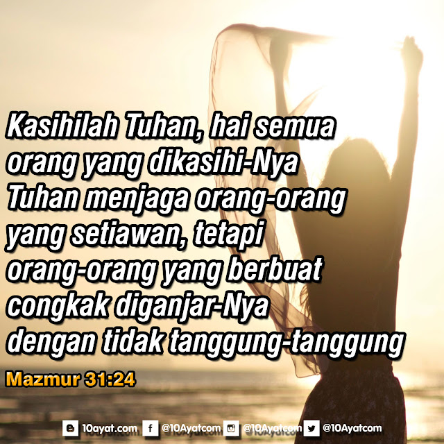 Kasihilah Tuhan, hai semua orang yang dikasihi-Nya! Tuhan menjaga orang-orang yang setiawan, tetapi orang-orang yang berbuat congkak diganjar-Nya dengan tidak tanggung-tanggung.