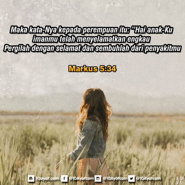 Maka kata-Nya kepada perempuan itu: ”Hai anak-Ku, imanmu telah menyelamatkan engkau. Pergilah dengan selamat dan sembuhlah dari penyakitmu!”
