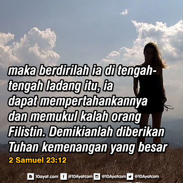 maka berdirilah ia di tengah-tengah ladang itu, ia dapat mempertahankannya dan memukul kalah orang Filistin. Demikianlah diberikan Tuhan kemenangan yang besar.