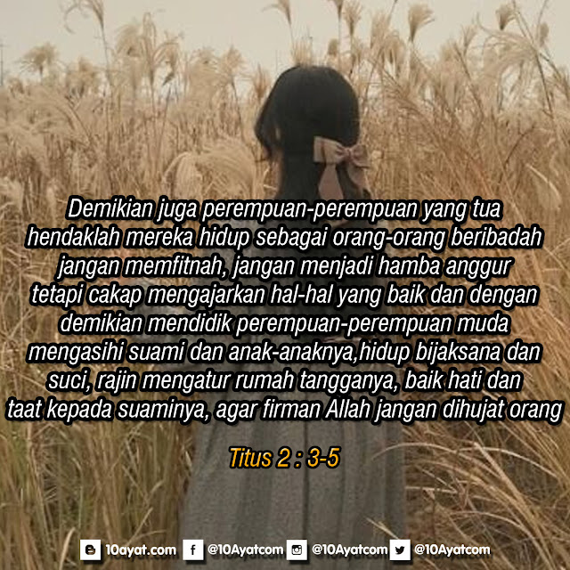 Demikian juga perempuan-perempuan yang tua, hendaklah mereka hidup sebagai orang-orang beribadah, jangan memfitnah, jangan menjadi hamba anggur, tetapi cakap mengajarkan hal-hal yang baik dan dengan demikian mendidik perempuan-perempuan muda mengasihi suami dan anak-anaknya, hidup bijaksana dan suci, rajin mengatur rumah tangganya, baik hati dan taat kepada suaminya, agar firman Allah jangan dihujat orang.