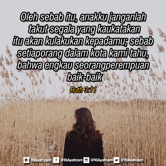 Oleh sebab itu, anakku, janganlah takut; segala yang kaukatakan itu akan kulakukan kepadamu; sebab setiap orang dalam kota kami tahu, bahwa engkau seorang perempuan baik-baik.