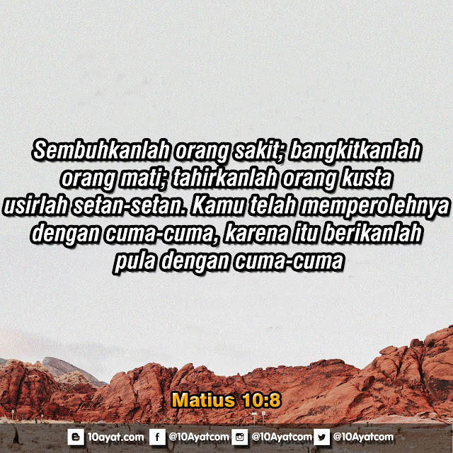 Sembuhkanlah orang sakit; bangkitkanlah orang mati; tahirkanlah orang kusta; usirlah setan-setan. Kamu telah memperolehnya dengan cuma-cuma, karena itu berikanlah pula dengan cuma-cuma.