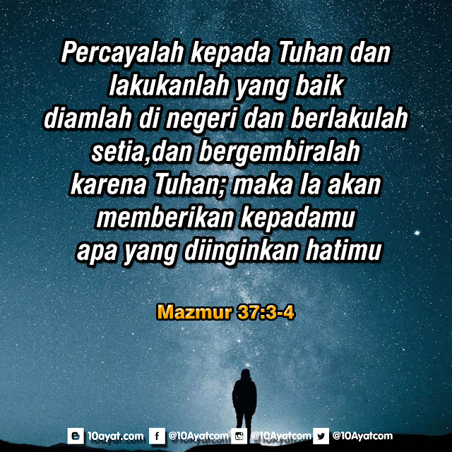 Percayalah kepada Tuhan dan lakukanlah yang baik, diamlah di negeri dan berlakulah setia, dan bergembiralah karena Tuhan; maka Ia akan memberikan kepadamu apa yang diinginkan hatimu.