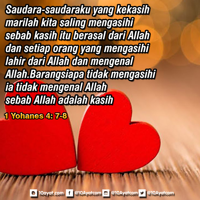 Saudara-saudaraku yang kekasih, marilah kita saling mengasihi, sebab kasih itu berasal dari Allah; dan setiap orang yang mengasihi, lahir dari Allah dan mengenal Allah. Barangsiapa tidak mengasihi, ia tidak mengenal Allah, sebab Allah adalah kasih.