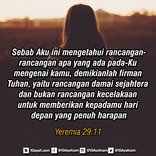 Sebab Aku ini mengetahui rancangan-rancangan apa yang ada pada-Ku mengenai kamu, demikianlah firman Tuhan, yaitu rancangan damai sejahtera dan bukan rancangan kecelakaan, untuk memberikan kepadamu hari depan yang penuh harapan.