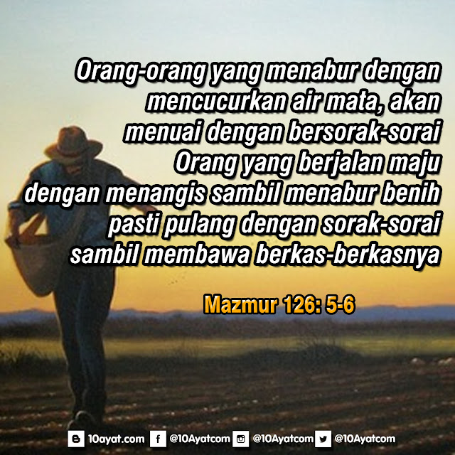 Orang-orang yang menabur dengan mencucurkan air mata, akan menuai dengan bersorak-sorai. Orang yang berjalan maju dengan menangis sambil menabur benih, pasti pulang dengan sorak-sorai sambil membawa berkas-berkasnya.