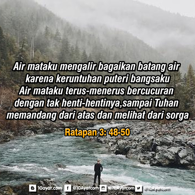 Air mataku mengalir bagaikan batang air, karena keruntuhan puteri bangsaku. Air mataku terus-menerus bercucuran, dengan tak henti-hentinya, sampai Tuhan memandang dari atas dan melihat dari sorga.