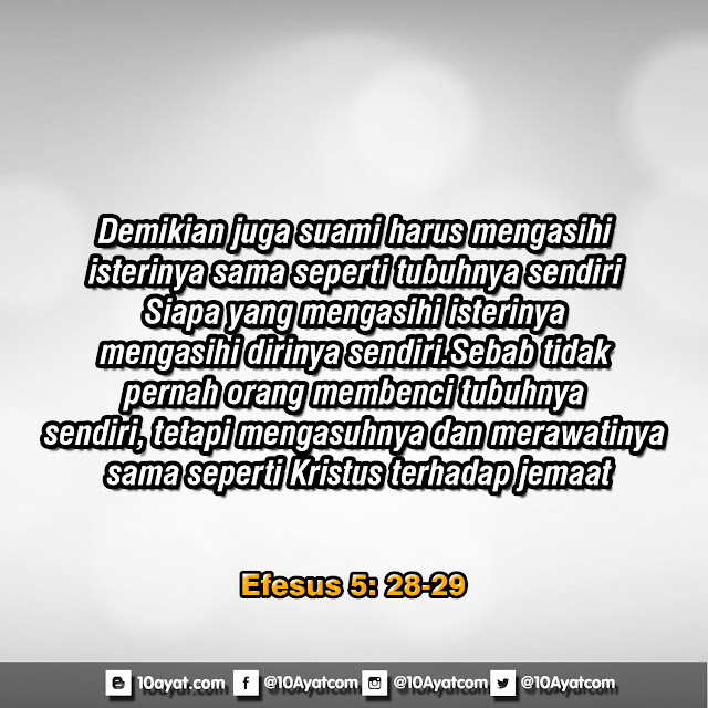 Demikian juga suami harus mengasihi isterinya sama seperti tubuhnya sendiri: Siapa yang mengasihi isterinya mengasihi dirinya sendiri. Sebab tidak pernah orang membenci tubuhnya sendiri, tetapi mengasuhnya dan merawatinya, sama seperti Kristus terhadap jemaat,