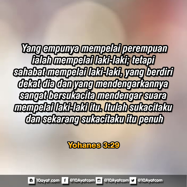 Yang empunya mempelai perempuan, ialah mempelai laki-laki; tetapi sahabat mempelai laki-laki, yang berdiri dekat dia dan yang mendengarkannya, sangat bersukacita mendengar suara mempelai laki-laki itu. Itulah sukacitaku, dan sekarang sukacitaku itu penuh.