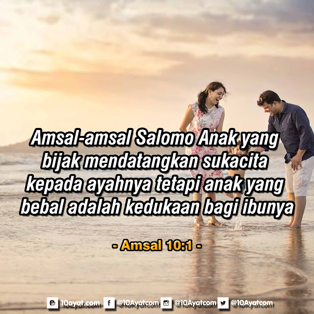 Amsal-amsal Salomo. Anak yang bijak mendatangkan sukacita kepada ayahnya, tetapi anak yang bebal adalah kedukaan bagi ibunya.