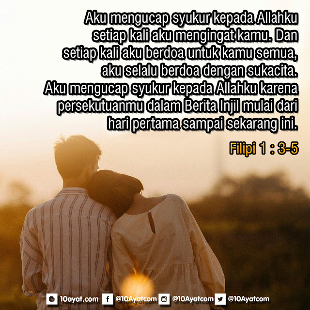 Aku mengucap syukur kepada Allahku setiap kali aku mengingat kamu. Dan setiap kali aku berdoa untuk kamu semua, aku selalu berdoa dengan sukacita. Aku mengucap syukur kepada Allahku karena persekutuanmu dalam Berita Injil mulai dari hari pertama sampai sekarang ini.