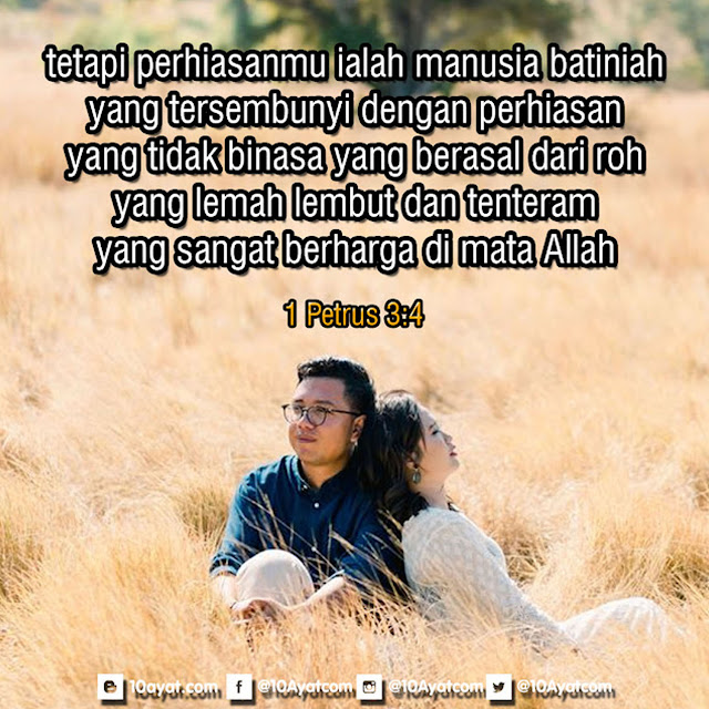 tetapi perhiasanmu ialah manusia batiniah yang tersembunyi dengan perhiasan yang tidak binasa yang berasal dari roh yang lemah lembut dan tenteram, yang sangat berharga di mata Allah.