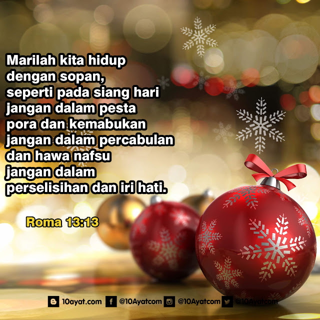 Marilah kita hidup dengan sopan, seperti pada siang hari, jangan dalam pesta pora dan kemabukan, jangan dalam percabulan dan hawa nafsu, jangan dalam perselisihan dan iri hati.