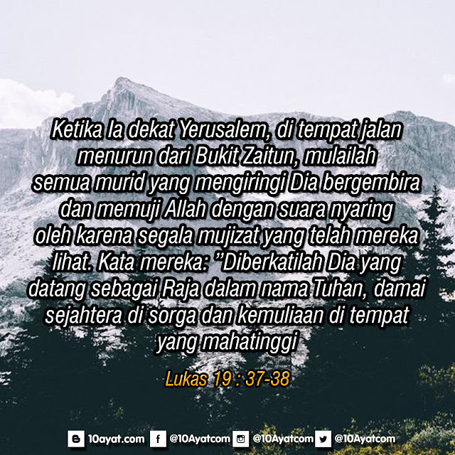 Ketika Ia dekat Yerusalem, di tempat jalan menurun dari Bukit Zaitun, mulailah semua murid yang mengiringi Dia bergembira dan memuji Allah dengan suara nyaring oleh karena segala mujizat yang telah mereka lihat. Kata mereka: ”Diberkatilah Dia yang datang sebagai Raja dalam nama Tuhan, damai sejahtera di sorga dan kemuliaan di tempat yang mahatinggi!”