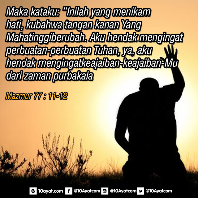 Maka kataku: ”Inilah yang menikam hatiku, bahwa tangan kanan Yang Mahatinggi berubah.” Aku hendak mengingat perbuatan-perbuatan Tuhan, ya, aku hendak mengingat keajaiban-keajaiban-Mu dari zaman purbakala.