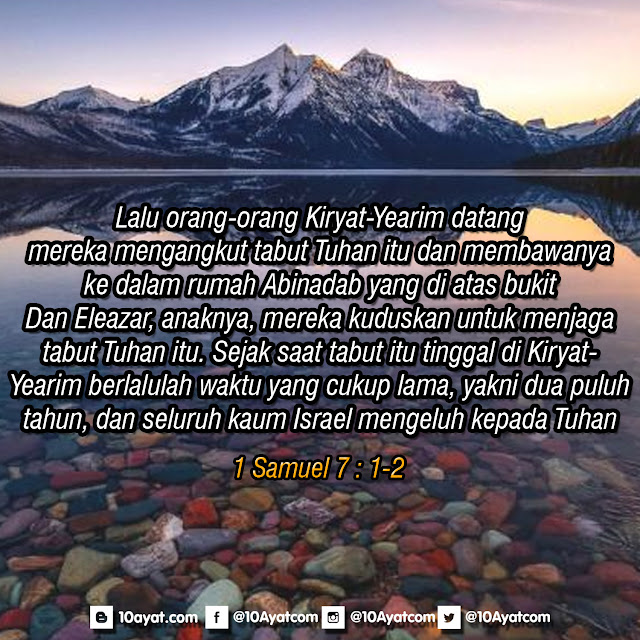 Lalu orang-orang Kiryat-Yearim datang, mereka mengangkut tabut f TUHAN itu dan membawanya ke dalam rumah Abinadab g yang di atas bukit. Dan Eleazar, anaknya, mereka kuduskan untuk menjaga tabut TUHAN itu. Sejak saat tabut itu tinggal di Kiryat-Yearim h berlalulah waktu yang cukup lama, yakni dua puluh tahun, dan seluruh kaum Israel mengeluh kepada TUHAN.