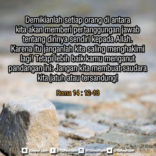 Demikianlah setiap orang di antara kita akan memberi pertanggungan jawab tentang dirinya sendiri kepada Allah. Karena itu janganlah kita saling menghakimi lagi! Tetapi lebih baik kamu menganut pandangan ini: Jangan kita membuat saudara kita jatuh atau tersandung!