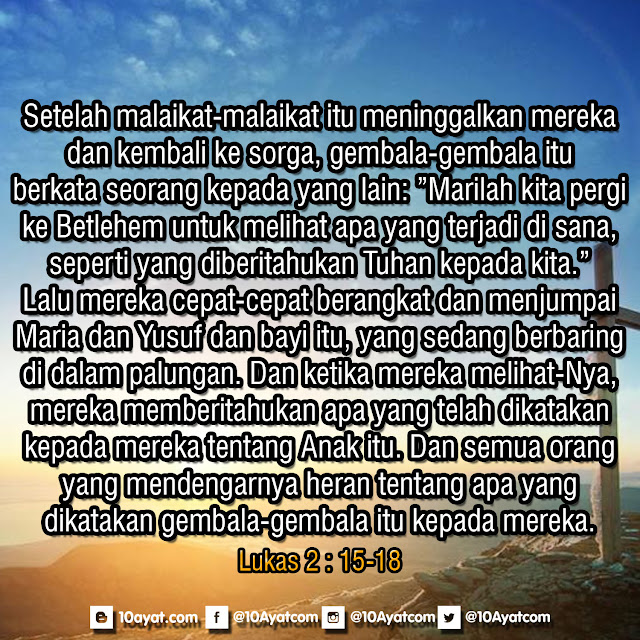 Setelah malaikat-malaikat itu meninggalkan mereka dan kembali ke sorga, gembala-gembala itu berkata seorang kepada yang lain: ”Marilah kita pergi ke Betlehem untuk melihat apa yang terjadi di sana, seperti yang diberitahukan Tuhan kepada kita.” Lalu mereka cepat-cepat berangkat dan menjumpai Maria dan Yusuf dan bayi itu, yang sedang berbaring di dalam palungan. Dan ketika mereka melihat-Nya, mereka memberitahukan apa yang telah dikatakan kepada mereka tentang Anak itu. Dan semua orang yang mendengarnya heran tentang apa yang dikatakan gembala-gembala itu kepada mereka.