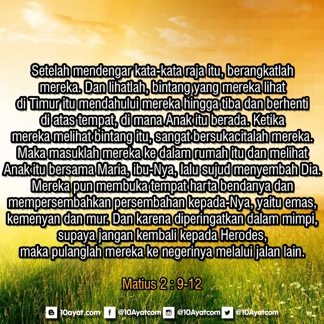 Setelah mendengar kata-kata raja itu, berangkatlah mereka. Dan lihatlah, bintang yang mereka lihat di Timur itu mendahului mereka hingga tiba dan berhenti di atas tempat, di mana Anak itu berada. Ketika mereka melihat bintang itu, sangat bersukacitalah mereka. Maka masuklah mereka ke dalam rumah itu dan melihat Anak itu bersama Maria, ibu-Nya, lalu sujud menyembah Dia. Mereka pun membuka tempat harta bendanya dan mempersembahkan persembahan kepada-Nya, yaitu emas, kemenyan dan mur. Dan karena diperingatkan dalam mimpi, supaya jangan kembali kepada Herodes, maka pulanglah mereka ke negerinya melalui jalan lain.