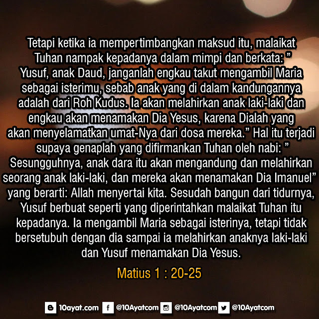Tetapi ketika ia mempertimbangkan maksud itu, malaikat Tuhan nampak kepadanya dalam mimpi dan berkata: ”Yusuf, anak Daud, janganlah engkau takut mengambil Maria sebagai isterimu, sebab anak yang di dalam kandungannya adalah dari Roh Kudus. Ia akan melahirkan anak laki-laki dan engkau akan menamakan Dia Yesus, karena Dialah yang akan menyelamatkan umat-Nya dari dosa mereka.” Hal itu terjadi supaya genaplah yang difirmankan Tuhan oleh nabi: ”Sesungguhnya, anak dara itu akan mengandung dan melahirkan seorang anak laki-laki, dan mereka akan menamakan Dia Imanuel” – yang berarti: Allah menyertai kita. Sesudah bangun dari tidurnya, Yusuf berbuat seperti yang diperintahkan malaikat Tuhan itu kepadanya. Ia mengambil Maria sebagai isterinya, tetapi tidak bersetubuh dengan dia sampai ia melahirkan anaknya laki-laki dan Yusuf menamakan Dia Yesus.