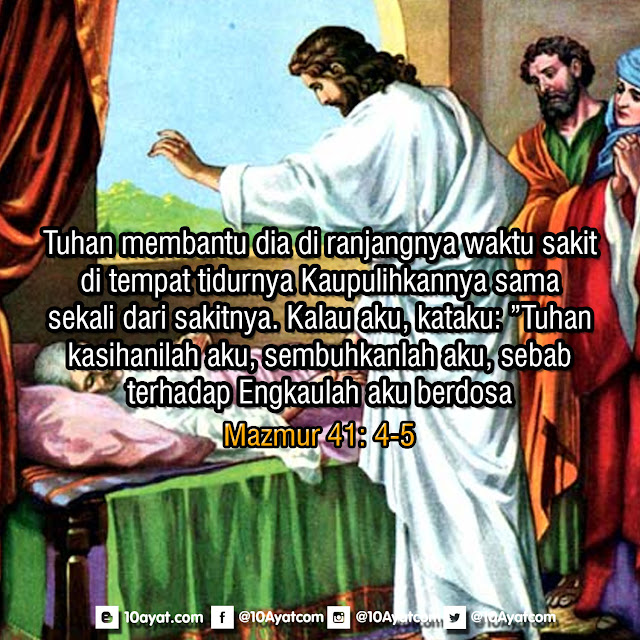 Tuhan membantu dia di ranjangnya waktu sakit; di tempat tidurnya Kaupulihkannya sama sekali dari sakitnya. Kalau aku, kataku: ”Tuhan, kasihanilah aku, sembuhkanlah aku, sebab terhadap Engkaulah aku berdosa!”