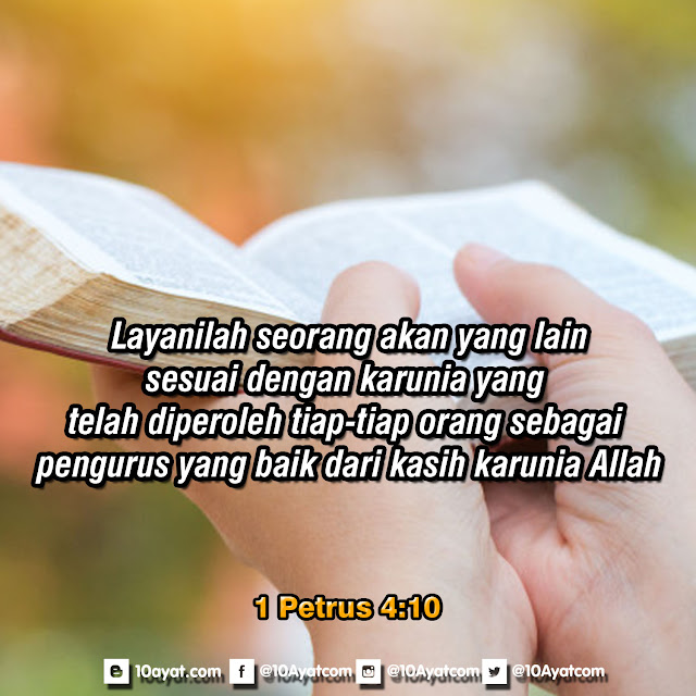 Layanilah seorang akan yang lain, sesuai dengan karunia yang telah diperoleh tiap-tiap orang sebagai pengurus yang baik dari kasih karunia Allah.