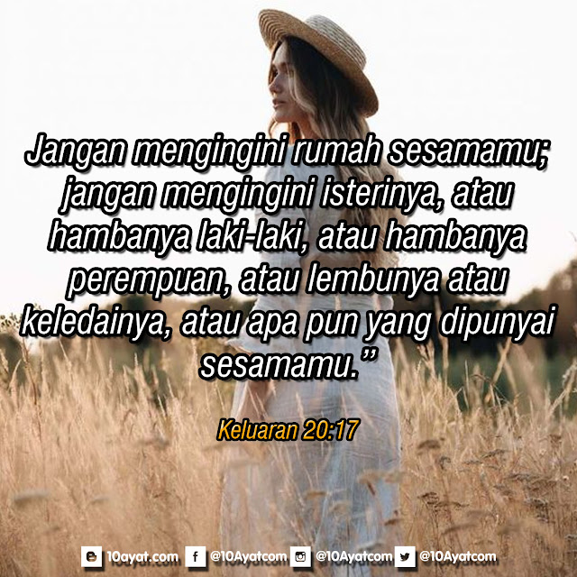 Jangan mengingini rumah sesamamu; jangan mengingini isterinya, atau hambanya laki-laki, atau hambanya perempuan, atau lembunya atau keledainya, atau apa pun yang dipunyai sesamamu.”