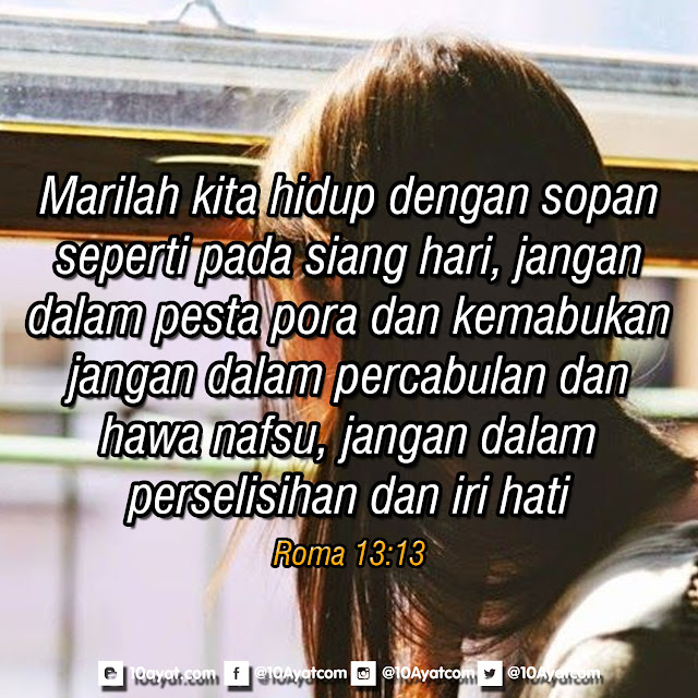 Marilah kita hidup dengan sopan, seperti pada siang hari, jangan dalam pesta pora dan kemabukan, jangan dalam percabulan dan hawa nafsu, jangan dalam perselisihan dan iri hati.
