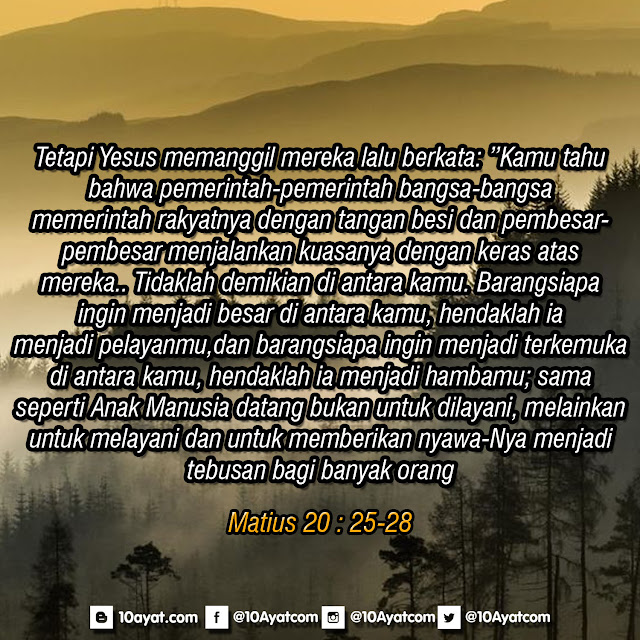 Tetapi Yesus memanggil mereka lalu berkata: ”Kamu tahu, bahwa pemerintah-pemerintah bangsa-bangsa memerintah rakyatnya dengan tangan besi dan pembesar-pembesar menjalankan kuasanya dengan keras atas mereka. Tidaklah demikian di antara kamu. Barangsiapa ingin menjadi besar di antara kamu, hendaklah ia menjadi pelayanmu, dan barangsiapa ingin menjadi terkemuka di antara kamu, hendaklah ia menjadi hambamu; sama seperti Anak Manusia datang bukan untuk dilayani, melainkan untuk melayani dan untuk memberikan nyawa-Nya menjadi tebusan bagi banyak orang.”