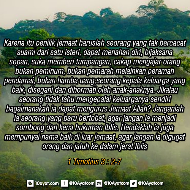 Karena itu penilik jemaat haruslah seorang yang tak bercacat, suami dari satu isteri, dapat menahan diri, bijaksana, sopan, suka memberi tumpangan, cakap mengajar orang, bukan peminum, bukan pemarah melainkan peramah, pendamai, bukan hamba uang, seorang kepala keluarga yang baik, disegani dan dihormati oleh anak-anaknya. Jikalau seorang tidak tahu mengepalai keluarganya sendiri, bagaimanakah ia dapat mengurus Jemaat Allah? Janganlah ia seorang yang baru bertobat, agar jangan ia menjadi sombong dan kena hukuman Iblis. Hendaklah ia juga mempunyai nama baik di luar jemaat, agar jangan ia digugat orang dan jatuh ke dalam jerat Iblis.