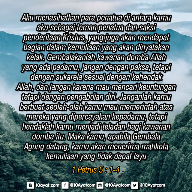 Aku menasihatkan para penatua di antara kamu, aku sebagai teman penatua dan saksi penderitaan Kristus, yang juga akan mendapat bagian dalam kemuliaan yang akan dinyatakan kelak. Gembalakanlah kawanan domba Allah yang ada padamu, jangan dengan paksa, tetapi dengan sukarela sesuai dengan kehendak Allah, dan jangan karena mau mencari keuntungan, tetapi dengan pengabdian diri. Janganlah kamu berbuat seolah-olah kamu mau memerintah atas mereka yang dipercayakan kepadamu, tetapi hendaklah kamu menjadi teladan bagi kawanan domba itu. Maka kamu, apabila Gembala Agung datang, kamu akan menerima mahkota kemuliaan yang tidak dapat layu.