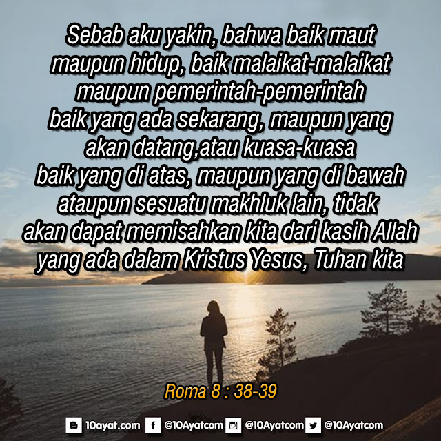 Sebab aku yakin, bahwa baik maut, maupun hidup, baik malaikat-malaikat, maupun pemerintah-pemerintah, baik yang ada sekarang, maupun yang akan datang, atau kuasa-kuasa, baik yang di atas, maupun yang di bawah, ataupun sesuatu makhluk lain, tidak akan dapat memisahkan kita dari kasih Allah, yang ada dalam Kristus Yesus, Tuhan kita.