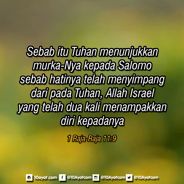 Sebab itu Tuhan menunjukkan murka-Nya kepada Salomo, sebab hatinya telah menyimpang dari pada Tuhan, Allah Israel, yang telah dua kali menampakkan diri kepadanya,