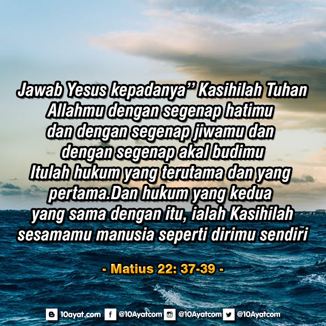 Jawab Yesus kepadanya: ”Kasihilah Tuhan, Allahmu, dengan segenap hatimu dan dengan segenap jiwamu dan dengan segenap akal budimu. Itulah hukum yang terutama dan yang pertama. Dan hukum yang kedua, yang sama dengan itu, ialah: Kasihilah sesamamu manusia seperti dirimu sendiri.